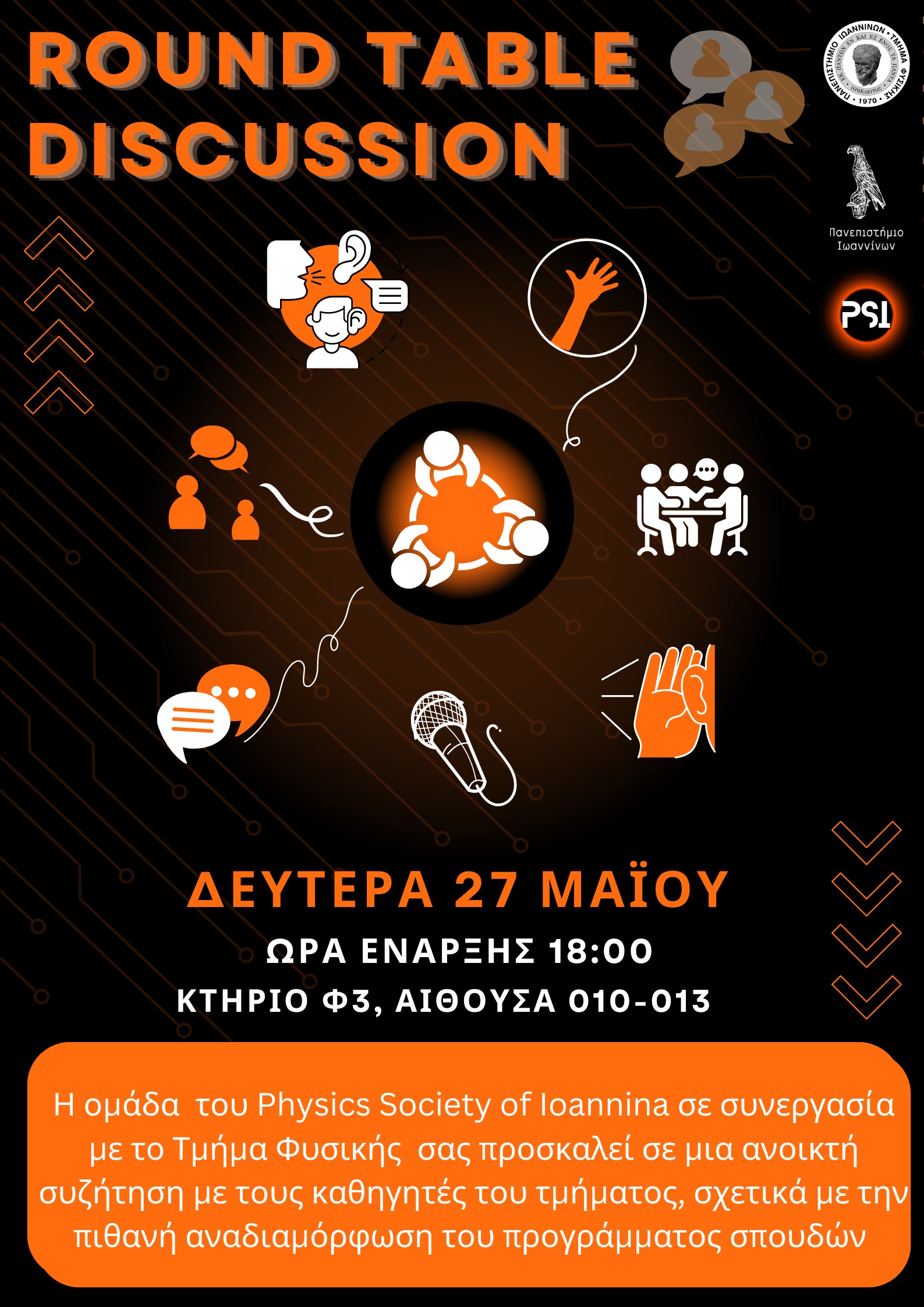 Δευτέρα 27 Μαΐου 2024, στην αίθουσα 010-013 του Κτηρίου Φ3, θα πραγματοποιηθεί μια ανοιχτή συζήτηση, στρογγυλή τράπεζα, με καθηγητές από διάφορους τομείς του Τμήματος. Έλα να ρωτήσεις, να ενημερωθείς, να ακούσεις για τις νέες εξελίξεις και για την πιθανή αναδιαμόρφωση του προγράμματος σπουδών. Θέλουμε να σε ακούσουμε