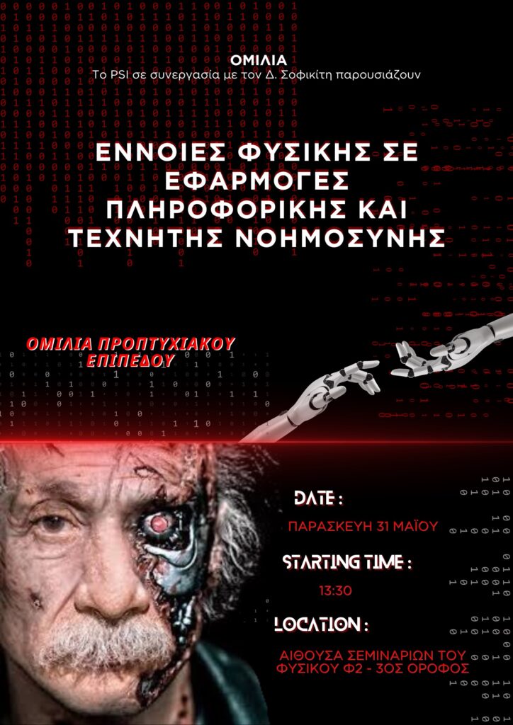 Ομιλία προπτυχιακού Επιπέδου από τον Δημήτρη Σοφικιτη με τίτλο “Έννοιες Φυσικής σε Εφαρμογές Πληροφορικής και Τεχνητής Νοημοσύνης”
