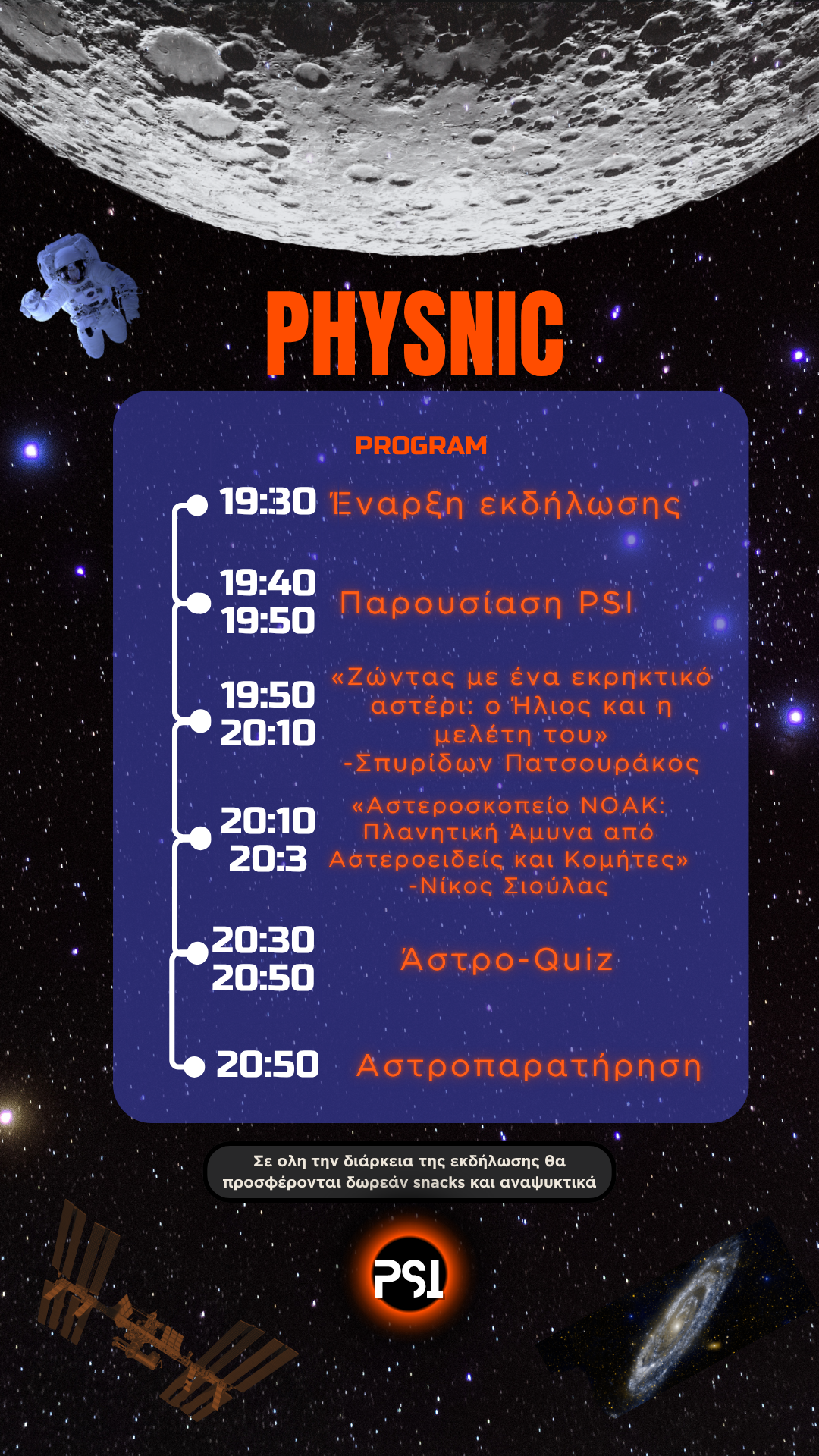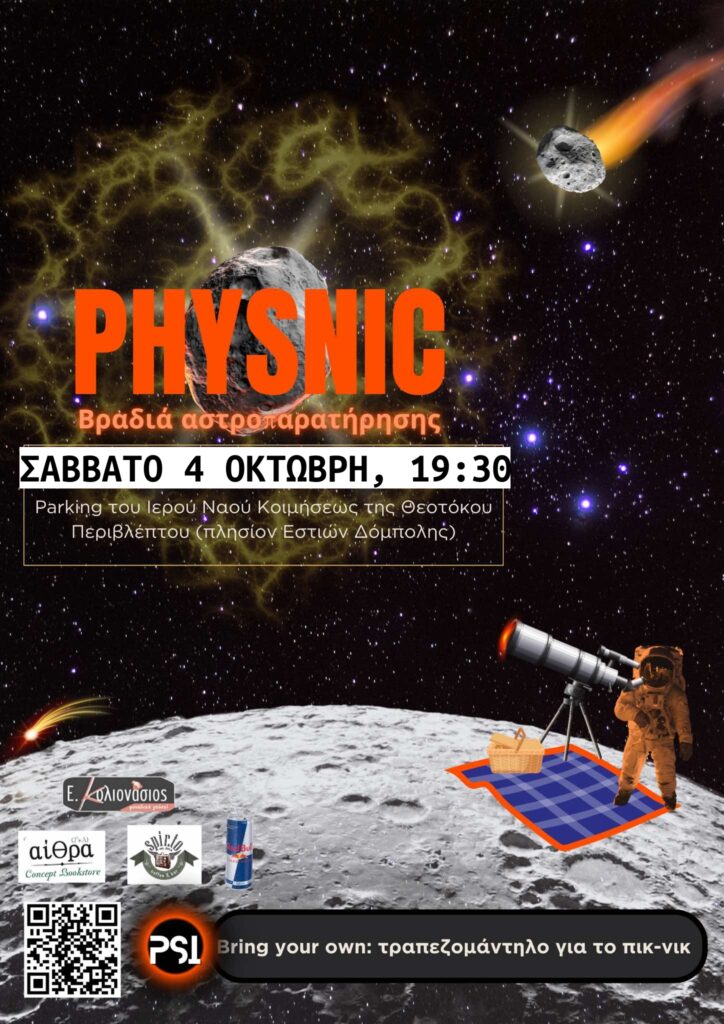 Το Physics Society of Ioannina (PSI) σας προσκαλεί στο Physnic, ένα ξεχωριστό βραδινό πικνίκ αστροπαρατήρησης, που θα πραγματοποιηθεί τo Σάββατο 4 Οκτωβρίου στις 19:30, στο πάρκινγκ του Ιερού Ναού Κοιμήσεως της Θεοτόκου Περιβλέπτου (πλησίον εστιών Δόμπολης).